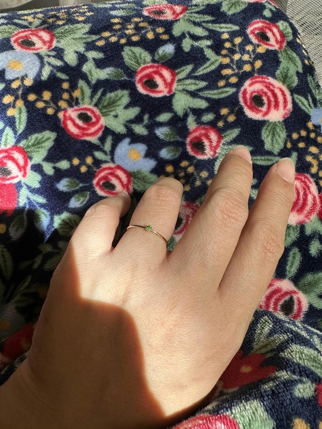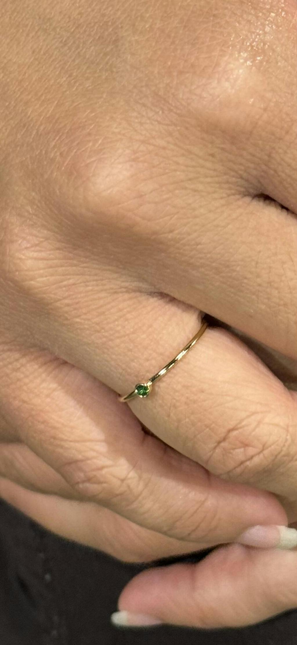 Emerald is May's birthstone. Celebrate the May baby in your life with our dainty May Birthstone Ring! Whether you wear it all by itself or pair it with another stacking ring, this pretty stacking ring is an elegant and affordable gift choice for friends and family born in May. Also, it's 14k gold filled, so you can wear it everyday - even to shower and to sleep!